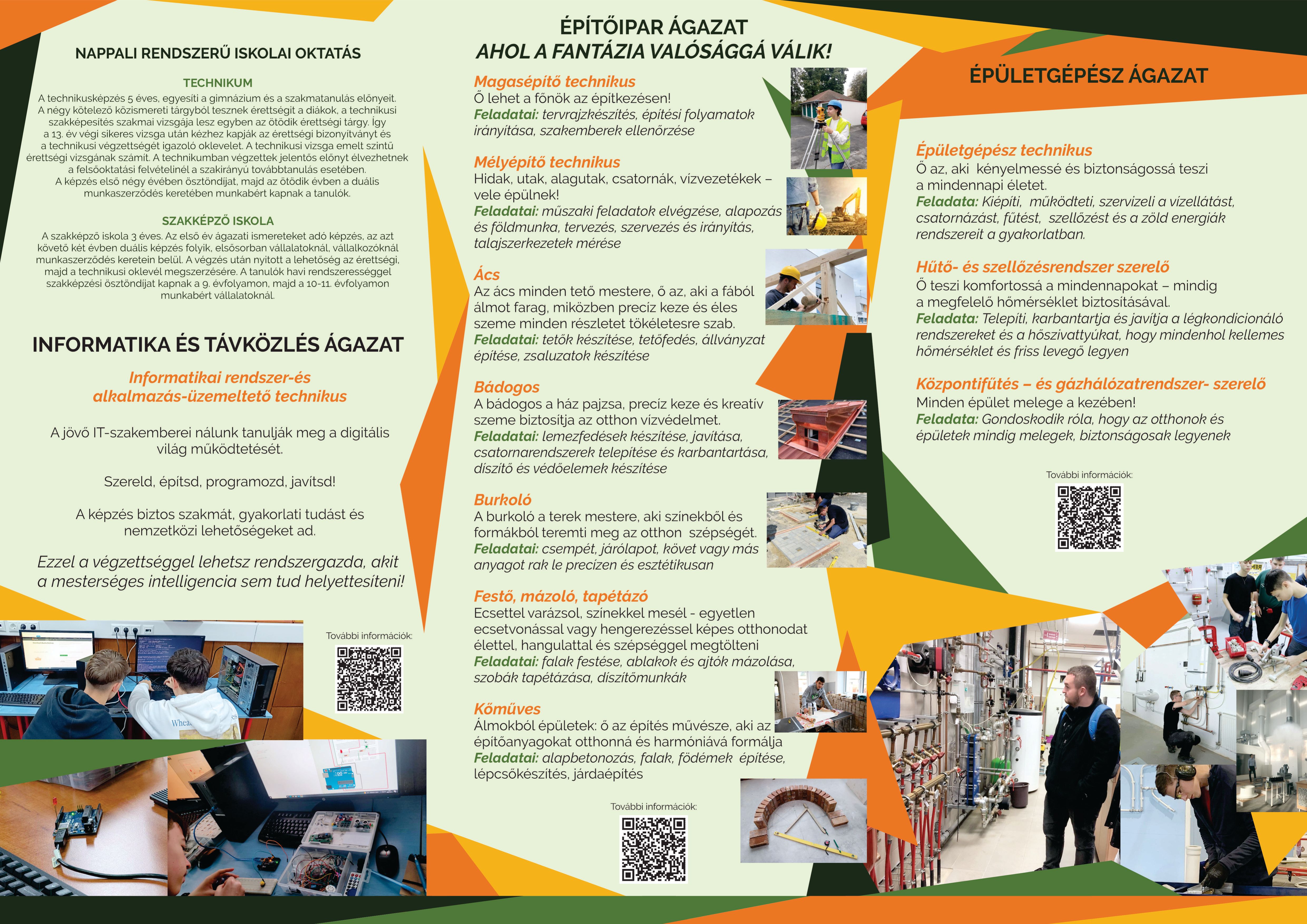1315 | Építőipar | angol, német | Magasépítő technikus Fő feladata az építés műszaki előkészítésével, kivitelezésével, fenntartásával, felújításával és átalakításával kapcsolatos műszaki feladatok ellátása. Nagyobb építkezéseknél ő az összekötő a kivitelezés és a tervezés között. Önálló tevékenységként vezethet építési vállalkozást, elláthatja a felelős műszaki vezető munkáját. A képzést elvégzők keresett szakemberek a munkaerőpiacon, de találó választás a felsőfokú tanulmányok folytatására nyitott fiatalok számára is. |